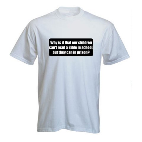 Why is it that our children can't read a Bible in school, but they can in prison? - Funny Printed T-Shirt [BLK10438]
